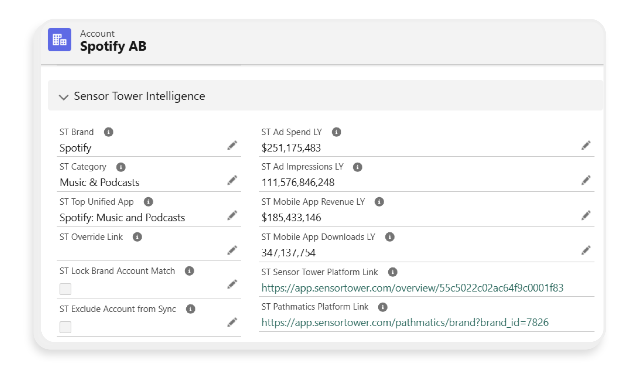 With Sensor Tower’s Salesforce App, those with access to Pathmatics Digital Advertising Insights or App Performance Insights can view key data points directly in Salesforce. Use Ad Spend, Ad Impressions, Mobile App Revenue, Mobile App Downloads, and Sensor Tower’s brand and category to develop a strategic pipeline. Arm your sales and marketing teams to more effectively prioritize and pitch prospects based on Sensor Tower data. Implementation is quick and easy, and Sensor Tower brands are matched to your accounts using a sophisticated machine learning model.